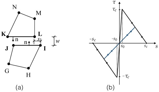 (a) A 2D interface element I-J-K-L formed between two four-node solid elements G-H-I-J and K-L-M-N, where s and w are the tangential and normal displacement jumps, and n is the normal direction of the two line segments; (b) the bond-slip law (shown for a linear-decreasing case).