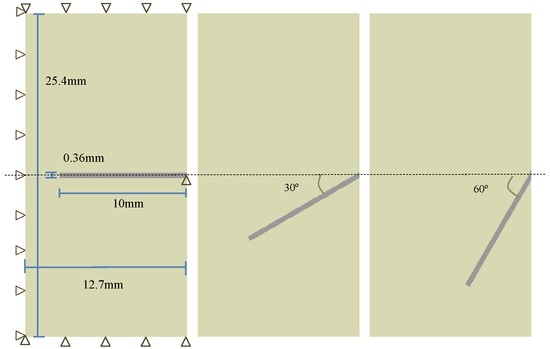 Additional described in Figure 4 are the boundary conditions imposed. Vertical displacements are prevented on the top and bottom sides, whereas horizontal movements are impeded on the left. The right end of the fiber is fixed in the vertical direction so that only horizontal movement is permitted. Note that the same boundary conditions are imposed for inclined fibers. The pulling process is carried out with intervals of 0.001 mm in the horizontal direction until 0.3 mm, followed with increments of 0.01 mm until the end.