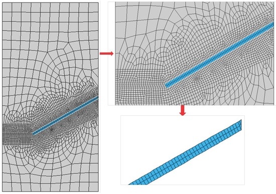 A typical mesh and detailed element distribution around the fiber for the inclination angle of 30 are demonstrated in Figure 5. Note that the right end of the fiber leans on a matrix wedge, which will spall later on. For this particular case, the matrix and the fiber consist of 2198 and 154 four-node solid elements, respectively, whereas 289 two-node contact pairs are placed at the interface. The mesh sensitivity analysis performed to achieve a balance between the computational efficiency and accuracy is going to be presented in Section 4.