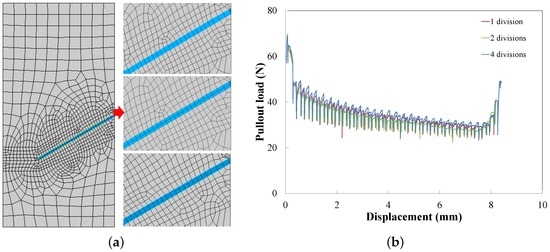 (a) Different element sizes (number of divisions) along the fiber; and (b) the corresponding pullout load-displacement responses.