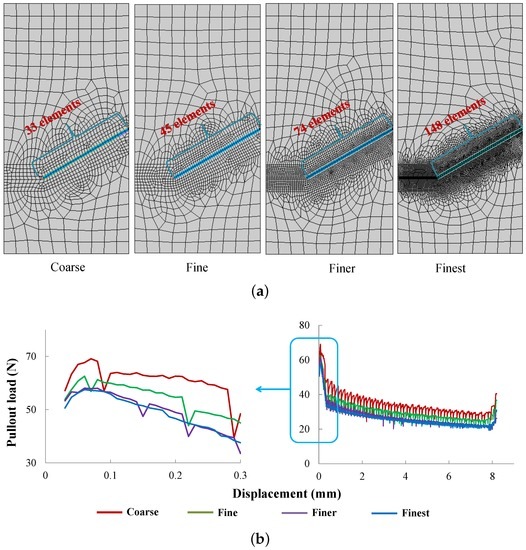 Along the longitudinal direction of the fiber, four different element sizes are considered, 0.303 mm, 0.222 mm, 0.135 mm and 0.068 mm, which lead to 33, 45, 74 and 148 divisions along the 10-mm length (see Figure 7a); the corresponding pullout load vs. slip end displacement curves are depicted in Figure 7b. Note that as the mesh gets finer, the response is smoother, and convergence is achieved. Specifically, the same peak load is obtained for the two finer meshes. In order to keep a balance between the computational efficiency and accuracy of the results sought, the mesh size of 0.135 mm is selected for further studies. It needs to be emphasized that the mesh sensitivity in the longitudinal direction is more pronounced than that in the transverse direction. In addition, from Figure 7b, it is observed that the maximum pullout load was achieved at a slip displacement of 0.07 mm, which agrees with the statement of Morton and Groves [30], who claimed that this value should be of the order of, but less than half, a fiber diameter.