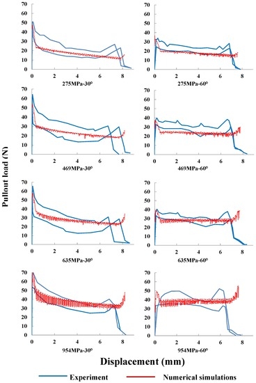 In order to verify the previously developed methodology, we compare the entire pullout curves with their experimental counterparts given by Leung and Shapiro [26]. This comparison is displayed in Figure 8 for fibers inclined at 30 and 60 with four different yield strengths given in Table 2. Note that both the peak loads and the general tendency are well captured; the numerical curves fall within the experimental range; in particular, the rising tail at the end of each pullout process is also reproduced.