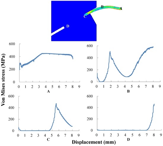 Taking Type 2 fiber (yield strength 469 MPa) with an inclination angle of 30 as an example, the von Mises stress evolutions for several characteristic points within the fiber are examined. These points are the pullout end A, the embedded end D and two intermediate ones B (location of the matrix spalling) and C, as depicted in Figure 9. Note that at Point A, the first peak stress was obtained when the pullout load reached its maximum due to interface debonding. Then, after a slight decrease, this stress increased again until yielding at the slip end displacement of 3 mm. Similar peaks are observed for B and C at slip displacement of 0.3 mm and a second peak upon yielding at 2 mm for Point B and 5 mm for Point C, respectively. The second peak is attributed to the stress concentration due to the cusp formed by matrix spalling. This is the snubbing effect described by Li et al. [24].