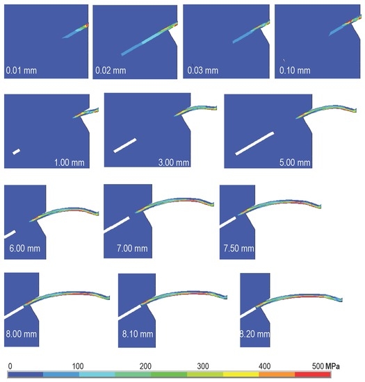 In the current work, Equation (4) is adopted as a first approximation to represent the matrix wedge, which is to be spalled off later on. A line of cohesive elements connects the wedge to the main part of the matrix. Trial runs are performed to determine the moment at which the matrix wedge should be deactivated. From then on, the elements within the matrix wedge cease to contribute to the overall stiffness. It bears emphasis that such a treatment is only to save computational time without detriment to the modeled phenomenon, since the first principal stresses within the matrix are checked, and the spalled length is adjusted if necessary, to ensure that the matrix would not present hyper-strength.