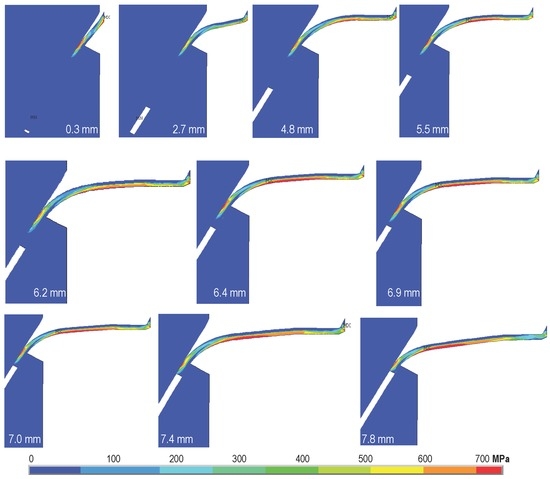 The first principal stress evolution for pullout displacement from 0.3 mm to 7.8 mm for a fiber inclination of 60 and a yield strength of 635 MPa (Type 3 in Table 2).