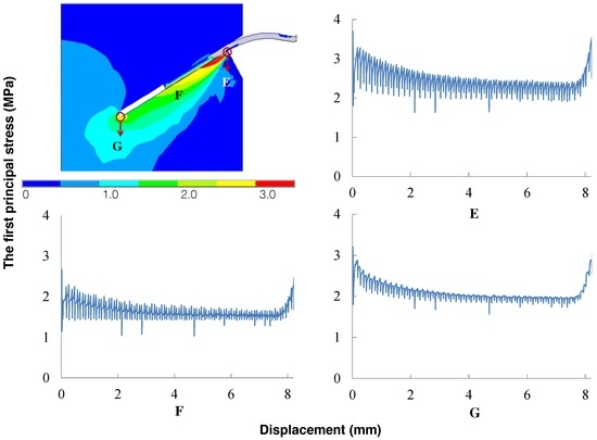 For the matrix, we are more concerned with the tensile stress distribution to ensure that no fracture should take place where matrix spalling is not expected. Three representative points, E, F and G (see Figure 12), are selected to display the first principal stress evolution in the matrix. Point E is where the matrix is expected to spall. Point G is the location where the fiber is anchored, whereas F is the point in the matrix close to the fiber center. Since the tensile strength was not measured, we estimate it to be 1/12 of the compressive strength, which is 3.0 MPa, as shown in Table 1. Note that at Point E, there is relatively large stress oscillation during the pullout process. This indicates, on the one hand, the stressing-relaxing cycle endured by the matrix. On the other hand, it can be attributed to the fact that the spalled matrix is assigned with a zero stiffness at the moment of spalling, whereas the real failure process is gradual. The stress evolution curves at Points F and G, assimilate those of global pullout curves in Figure 8, each with a different amplitude. Furthermore, it is noted from Figure 12 that the maximum tensile stress due to the axial pullout of the fiber and bending load occurs at the close region of the fiber exit point. This agrees with the assumption adopted by Zhang and Li [37] in their study on the effect of inclination angle on fiber rupture load in fiber-reinforced cementitious composites.