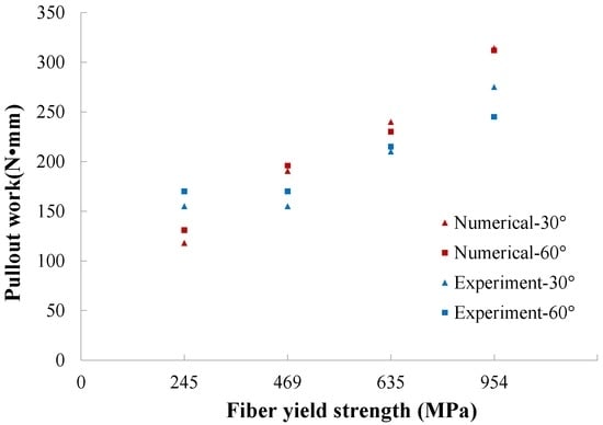 The pullout work is calculated as the area under the load vs. slip displacement curve. In Figure 13, both experimental and numerical values for fibers inclined at 30 and 60 are depicted. Note that as a general trend, the pullout work increases with the increase of fiber yield strength, and such a tendency is correctly captured by our numerical model.