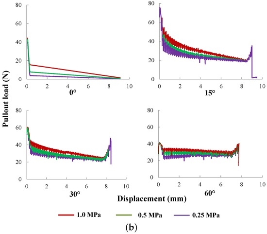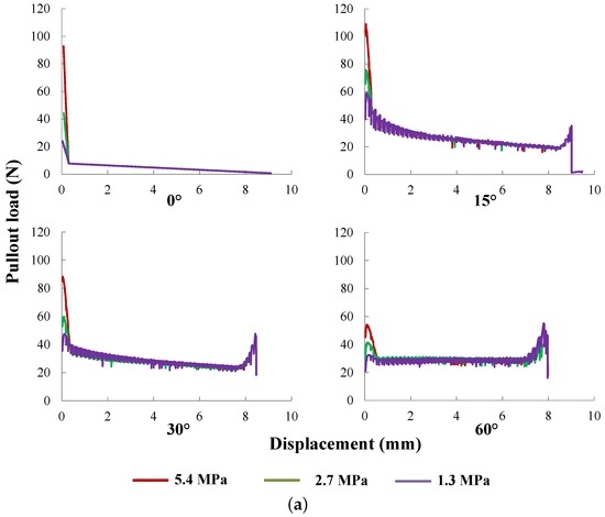 Pullout curves for: (a) at 1.3, 2.7 and 5.4 MPa; is kept at 0.5 MPa; and (b) at 0.25, 0.50 and 1.0 MPa, whereas is fixed at 2.7 MPa. Fibers are inclined at 0, 15, 30 and 60, respectively.