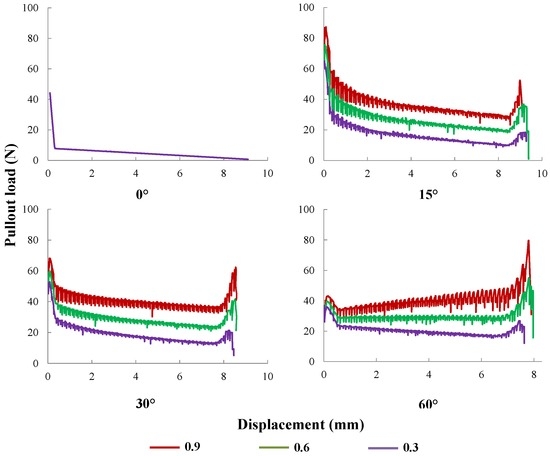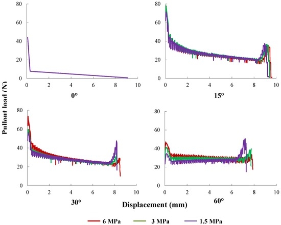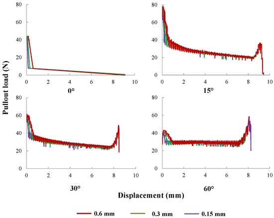 As mentioned before, the critical slip displacement, , denotes the maximum value for which interfacial bonding due to internal physical and chemical cohesion is active. Three different values, 0.15, 0.30 and 0.60 mm, of are selected to demonstrate such an effect for fibers inclined at 0, 15, 30 and 60, respectively, in Figure 15. Note that the difference of the pullout curves is only perceived at the first decaying branch; larger leads to a less steep drop from the maximum pullout load.