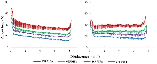 It needs to be pointed out that as the fiber yield strength increases, the numerical pullout curves exhibit more oscillations. This means that the relative slip between fiber and matrix is more unstable; thus, finer meshes are needed to reduce the noise observed in those curves for fibers of higher strength.