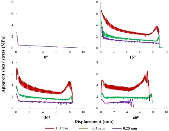As described above, the interfacial bond between fiber and matrix is mainly composed of two parts, internal frictional resistance and bond strength. Simulations focusing on varying and separately for fibers inclined at 0, 15, 30 and 60 are carried out. The obtained pullout curves are demonstrated in Figure 14, where three different values, 1.3, 2.7 and 5.4 MPa for , 0.25, 0.50 and 1.0 MPa for , are considered. It is noted that has a dominant influence at the pre-peak stage (when the slip-end displacement is less than 0.3 mm), in particular over the peak load, whereas plays a more important role during the post-peak phase. In addition, the total slip displacement decreases as the inclination angle increases. This means the critical embedment length decreases with the inclination angle.