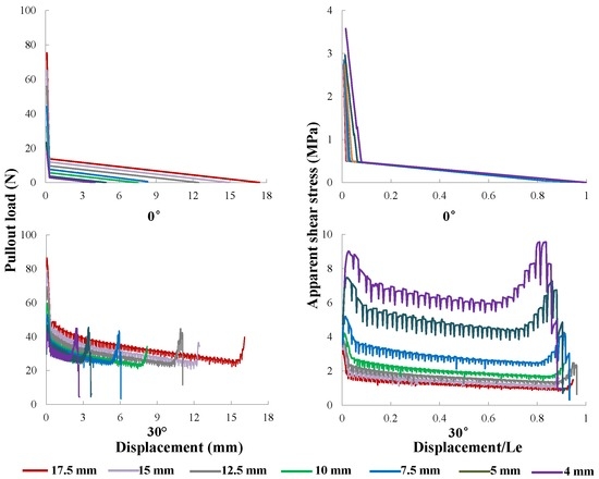 In Figure 19, the pullout responses for fibers of different lengths from 4 mm to 17.5 mm inclined at 0 and 30 are illustrated. Since a longer fiber length also means a wider interface area, thus a higher pullout load is attained. For a more clear representation, the apparent interfacial shear stress vs. relative slip normalized by the initial embedment length, which is equal to , is also shown. It is observed that, for both aligned and inclined fibers, convergent results are achieved for longer fibers. This indicates that, when the rest is kept the same, the apparent bond strength coincides with the real one if the fiber embedment length is relatively large. Otherwise, the interface strength obtained through the pullout tests will be over-estimated.