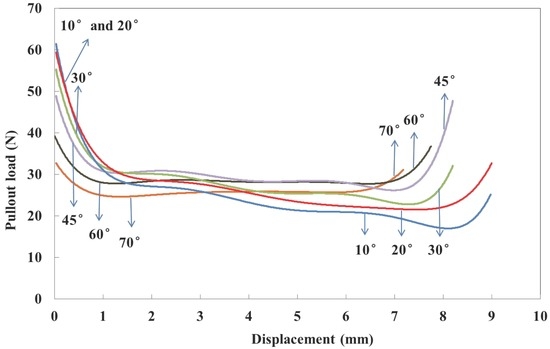 The effect of the fiber inclination angle on the entire pullout response is explored for six orientations from 10 to 70 as demonstrated in Figure 20. Note that peak values for fibers inclined at 10 and 20 are higher than the rest, whereas the post-peak values during 2 to 7 mm only vary slightly. This is due to the fact that the pullout force is only a component of the bonding force before de-bonding. Afterwards, the contribution of fiber bending and friction is increased for all inclination angles.