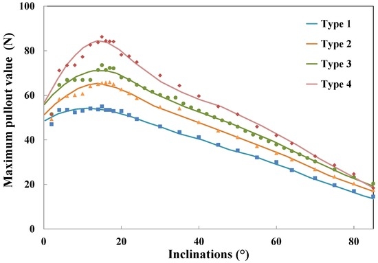 To explore the effect of fiber inclination, a spectrum of angles up to 85 is simulated by keeping the fiber, matrix and interface properties constant. It is known that the length of the spalled matrix and the moment when the matrix spalls both matter in the pullout responses. According to Laranjeira et al. [35], spalling is considered to take place right after the beginning of fiber debonding, but prior to its full accomplishment. After some trial runs, this slip displacement is estimated, which is around 0.01 mm. The spalling length is calculated according to Laranjeira [35], which corresponds well with that of Leung and Shapiro [26]. Simulations of different fiber yield strengths are carried out, and the obtained pullout curves are plotted in Figure 21. The fitted function for the maximum pullout load in terms of fiber inclination angle is given by Equation (11), and the corresponding fitting parameters are listed in Table 5.