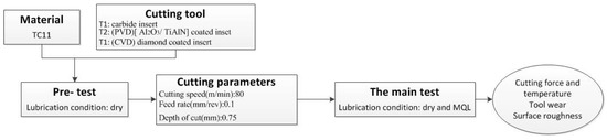 A tool material with high hardness values, low friction coefficients and superior thermal characteristics is an essential key factor when machining titanium alloy. Researchers have been devoted to finding more suitable coating materials for cutting tools. Carbide tools are still mostly used in the industry when machining titanium alloy. Liang et al. [2] investigated the possible beneficial effect of Ni3Al binder on WC-based cemented carbides by using tools prepared with the spark plasma sintering technique. By analyzing tool wear at different speeds, WC-10Ni3Al was proved to have a better performance. Nanocomposite coatings have been investigated and used widely in recent years for their extremely high hardness and heat resistance. Rodríguez-Barrero et al. [3] investigated the performances of several nanostructured coatings for drilling under high temperatures, including AlCrSiN, μAlTiN, TiAlCrN, AlTiCrN, AlCrN, AlTiSiN, and TiAlSiN. The results of flank wear, adhesion, chip evacuation and force show that TiAlSiN, AlTiSiN, and μAlTiN have better performances because of greater hardness, oxidize at higher temperatures and have low chemical affinity. It should be noted that all the coatings were applied by a post-process named “drag grinding” before the test, which leads to an increase of tool life by up to 30%. Liu et al. [4] studied the wear performance of (nc-AlTiN)/(a-Si3N4) coating and (nc-AlCrN)/(a-Si3N4) coating turning Ti6Al4V and obtained a good surface finish by applying the minimum quantity lubrication (MQL). Normally, diamond tools are not suggested when machining titanium alloy due to its high chemical activity and graphitization. However, researchers have applied diamond-coated tools for certain circumstances. Minton et al. [5] performed new-dry cutting with a specially designed internally cooled diamond-coated tool, resulted in a long tool life while maintaining high standards of the surface finish.