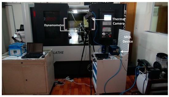 The experiments under dry and MQL condition were performed using an ETC3650U (Shenyang No. 1 Machine Tool Sales Co., Ltd., Shenyang, China) turning center. Seen from Figure 3, a Kistler 9129AA (Kistler, Winterthur, Switzerland) dynamometer was mounted under the workpiece to measure the cutting force. To investigate the coolant effect of MQL, a FlirA615 (Behringer Eurolive, New York, NY, USA) thermal camera with resolution of 640 × 480 pixels and thermal sensitivity of 50 mK was used. The other details of the experiment are listed in Table 3.