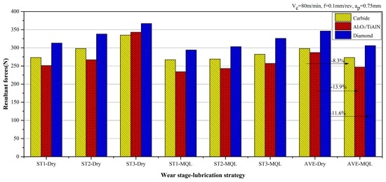 Cutting forces were measured during the experiments with the cutting parameters given in Table 3. The resultant forces (FR) during three tool wear stages (ST1: initial wear stage, ST2: steady wear stage, ST3: intensive wear stage) and the average one of the whole cutting time duration (AVE) under dry and MQL conditions are compared in Figure 4. For either dry or MQL conditions, the lowest forces were obtained with the Al2O3/TiAlN-coated tools and the highest with the diamond-coated tools. This might be the result of both the coating friction reduction and contact radius incensement. Comparing to the carbide tool, the Al2O3/TiAlN coating with a thickness of 1.340 μm, obtained by the PVD process, has a lower friction coefficient and similar tool contact radius. The diamond tool was coated beyond the carbide tool by the CVD process, with a thickness of 3.160 μm, which increases the contact radius of the tool by a great amount and led to much greater cutting forces. It also can be seen from Figure 3 that for the same cutting tool, when MQL was applied, the resultant forces were reduced for a certain amount, ranging from 8.3% to 13.9%.