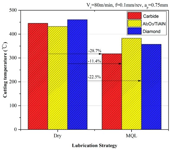 Figure 5 shows the effect of MQL on the cutting temperature and different tools. It can be seen that for the same lubrication strategy, the lowest temperature was obtained with the Al2O3/TiAlN-coated tool and the highest with the diamond-coated tool. Besides, by using MQL, the cutting temperatures were reduced to a greater extent compared to the cutting forces, ranging from 22.5% to 28.7%.