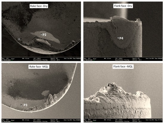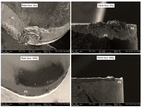 Figure 6 and Table 4 show the SEM micrographs and EDS analysis of the wear track at the rake and flank face of the carbide tools under dry and MQL conditions. For both conditions, the adhering materials smear on the rake face, which is proved to be TC11 transferred from the chip material. The amount of the deposited material on the rake face is greater than the flank face, which is caused by the higher temperature of the rake face. With the relative movement of the chips, workpiece material and tool, grains of the tool material adhered and were taken from the tool, causing the adhesion wear. By comparing the rake and flank faces of the tool under two lubrication conditions, using MQL led to a decrease in the amount of the layer adhered to the tool. Moreover, the presence of the C element in these adherent layers (seen in Table 4) is evidence of the diffusion of carbon from the tool material. Under the dry condition, the deposited layer can be found and the fresh surface is presented, which reveals that the tool substrate strength decreased and thereby the tool material was torn and taken away. On the other hand, the main wear pattern on the rake face of the carbide tool under the MQL condition is adhesive wear, less severe than that of the flank face, and abrasive wear, which can be seen by the clear abrasive marks. This phenomenon is also evidence that MQL can reduce the adhesive wear.