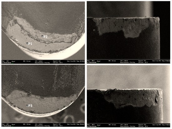 The SEM images of a worn Al2O3/TiAlN-coated tool in combination with EDS are shown in Figure 7 and Table 5. Under the dry condition, the tool failed in the form of the coating peeling off and chip breaking, which is probably due to the force and thermal impact during machining. The adhesive layer was peeled off the tool. The EDS results show evidence of adhesion and diffusion. Compared to the carbide tool, the presence of the O element in a higher amount indicates more severe oxidative wear, which was probably caused by the higher temperature.