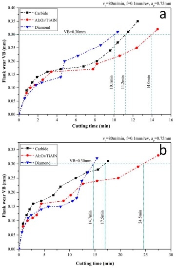 During the experiments, the average flank wear VB versus the cutting time for each tool at a cutting speed of 80 m/min under dry and the MQL condition was measured and is depicted in Figure 9. Under the dry condition, the diamond tool underwent the longest initial wear stage and a small period of the steady stage. At the time of 4 min, the diamond coating on the cutting edge desquamated and the substrate with lower strength compared to the carbide tool (the result of coating pre-processing) participated in the cutting process. As a result, the tool wear accelerated and the shortest wear period among the three tools was obtained. This is understandable because the highest cutting force and temperature of the tool (shown in Section 3.1) result in oxidization and graphitization of the coating material. It also can be seen from Figure 8 that at the time of 8 min, the tool wear of Al2O3/TiAlN-coated tool suddenly got into the intensive wear stage, which is the result of the coating peeling off and cutting edge breakage as mentioned in Section 3.2. However, the Al2O3/TiAlN-coated tool still obtained the longest wear period, which indicates that the coating is suitable for the TC11 turning process under the cutting condition of this paper. From the result in Section 3.2, we can see that, under the MQL condition, the diamond-coated tool still failed because of the coating peeling. However, the steady wear period of the diamond tool was prolonged to the time about 12 min, before which the wear of the tool is quite low. The effect of MQL on the Al2O3/TiAlN-coated tool was reflected in the lower wear of the initial stage and the longer duration of the steady wear stage. Besides, from both the curve and result in Section 3.2, we can infer that MQL has the effect of avoiding edge breakage and coating peeling through decreasing the force impact and temperature.