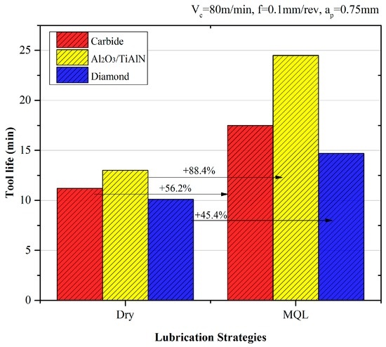 The tool life comparison of different coating tools under two lubrication conditions are exhibited in Figure 10. The diamond tool obtained a comparable tool life under the MQL condition. It is also noted that the MQL exceed the tool life by 88.4% for the Al2O3/TiAlN-coated tool, which allows us to infer that the MQL condition has a significant effect on improving the tool life when the coating is chosen properly.