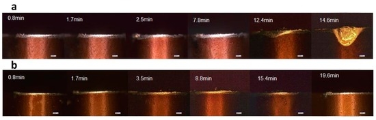 Figure 11 shows the optical images of tool wear and failure of the Al2O3/TiAlN-coated insert. During the steady wear stage, adhesive material was found on the cutting edge under the dry condition from t = 0.8 min to the time of tool failure. On the other hand, the tool edge was comparably clean under the MQL condition. Thus, the difference of tool wear during the steady stage is quite obvious. When the cutting time reaches 12.4 min, tool failure in terms of breaking can be seen from Figure 11a under the dry condition, while during the same time period, the tool under MQL was still undergoing steady wear. Similar to the result given by SEM and EDS tests, by using MQL, adhesive wear was reduced and premature tool failure such as chip breaking could be avoided.