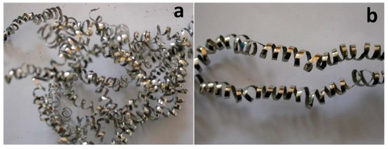 Furthermore, Figure 12 shows the optical images of chips removed by the Al2O3/TiAlN-coated tool at cutting time at about 12 min under dry and MQL conditions. It can be observed that the chip produced under the dry condition is tangled, while the chip produced under the MQL condition is regular. The adhesive material peeling from the insert caused uneven voids on the rake face and uniform build-ups on the cutting edge, which produced an unsmooth back face and an uneven curvature of the chip. This result further proves that by using MQL, the wear condition of the cutting tool can be improved.