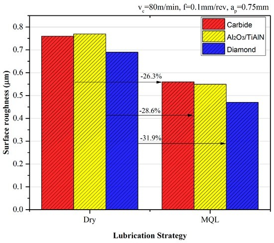 Machined surfaces were measured to analyze the integrity in relation to the roughness (Ra). Tests were carried out three times for each surface and the mean values are shown in Figure 13. Under dry and MQL conditions, the diamond-coated tool provided the best surface finish even though the tool wear was intensive. This is probably due to the smooth and low friction surface of the diamond coating. Besides, the contact radius of the tool is the greatest, which is negatively correlated to surface roughness. Further, consider that the diamond-coated tool can obtain a satisfactory tool life when MQL is applied (seen in Section 3.3). When the surface roughness is mainly considered, the diamond-coated tool can be a choice depending on the condition that the cutting parameters and cooling strategy are chosen properly. It also can be seen in Figure 10 that by using MQL, the surface roughness can be reduced by about 30%. The diamond-coated tool obtained the highest reduction of 31.9% and the PVD-coated tool the second highest reduction, which is probably due to the elongation of the steady wear state which results in better tool wear.
