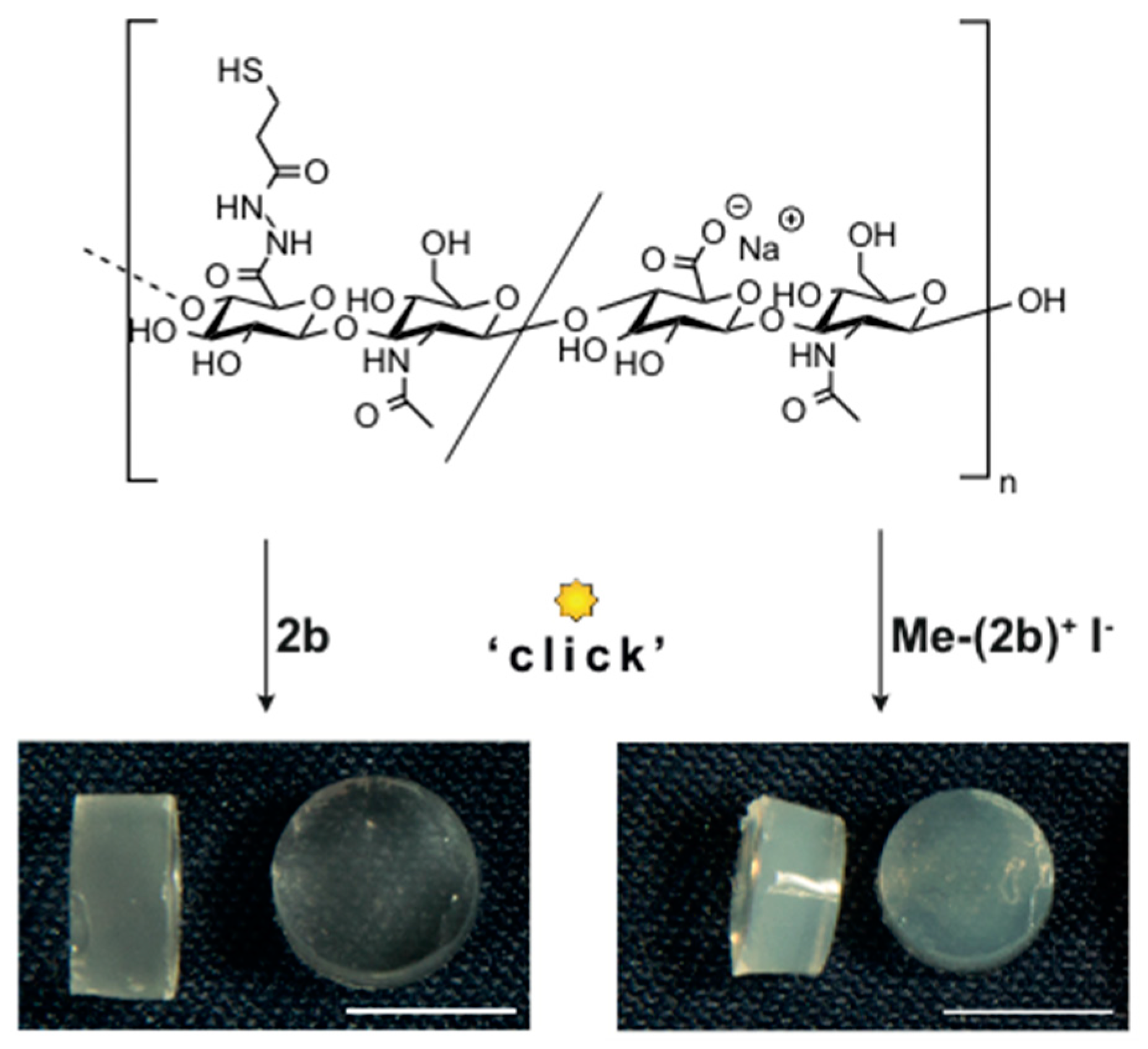 - Takahashi, A.; Suzuki, Y.; Suhara, T.; Omichi, K.; Shimizu, A.; Hasegawa, K.; Kokudo, N.; Ohta, S.; Ito, T. In Situ Cross-Linkable Hydrogel of Hyaluronan Produced via Copper-Free Click Chemistry. Biomacromolecules 2013, 14, 3581–3588. [Google Scholar] [CrossRef] [PubMed]