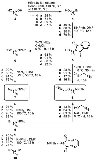 - Kress, K.C.; Kaller, M.; Axenov, K.V.; Tussetschläger, S.; Laschat, S. Synthesis and mesomorphic properties of calamitic malonates and cyanoacetates tethered to 4-cyanobiphenyls. Beilstein J. Org. Chem. 2012, 8, 371–378. [Google Scholar] [CrossRef] [PubMed]