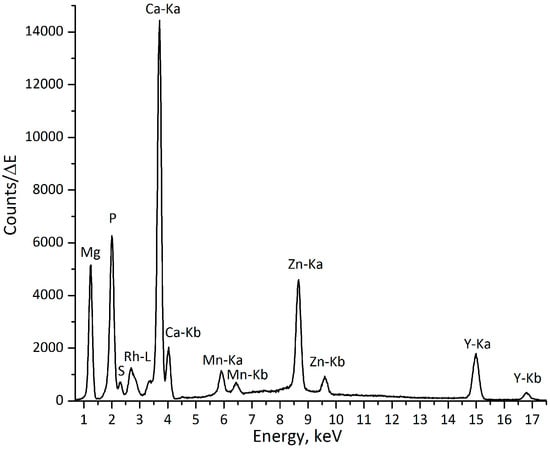 The data analysis was performed using the QXAS-AXIL software package (IAEA Laboratories Seibersdorf, Seibersdorf, Austria) [37]. The elements of interest were included in the fitting model: Mg, P, S, Ca, Mn, Zn, and Y. The elemental maps were created with X-Ray Lab software (X-ray Lab, Atominstitut, Vienna, Austria). The line scans represent the plotted central line (lengthwise) throughout the scan (data normalized to the maximum value) allowing for easier comprehension of the changes in distributions of elements (prepared using Microsoft Excel 2016). The fluorescence spectrum was plotted using Origin (version 8.6, OriginLab Corporation, Northampton, MA, USA).