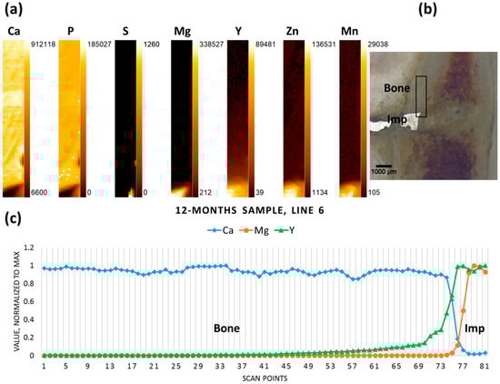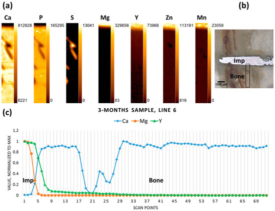 The implanted pin in the nine-month-old sample had mostly degraded, though some metal chunks were still visible; the scanned area lies on the previous position of the implant, already replaced by newly-formed tissue (Figure 5b). No metallic particles could be recognised in this selected area using the microscope, however both the elemental map and the line scan indicate the presence of the minute Mg-containing particles (hot spot on the Mg elemental map), as well as elevated Y (together with the other implant constituents—Mn and Zn) in the right-hand section of the scanned area, which represents less mineralized bone (Figure 5a,c). In the newly-formed mineralized bone tissue (high Ca and P, low to no S) low levels of Mg were co-localized with Ca, as usual in healthy bone.