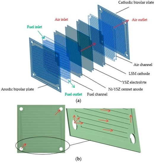 Figure 1, and it consists of (from the left side): a cathodic bipolar plate, an air channel, a LSM (strontium-doped lanthanum manganite) cathode, a YSZ (yttria-stabilized zirconia) electrolyte, a Ni–YSZ cermet anode, a fuel channel, and an anodic bipolar plate. Flow channels were designed by Bossel [