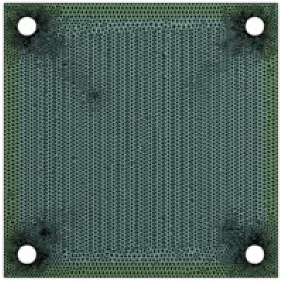 7], and the idea was to enable separate flows between two pairs of opposite orifices located at four corners of the bipolar plates. Each of the bipolar ribbed plates had an air channel system on its one side and a fuel channel system on the reverse side. One channel in adjacent plates was used for the air flow along the cathode electrode, while the other one was used for the fuel flow along the anode of each cell. The geometry parameters are presented in
