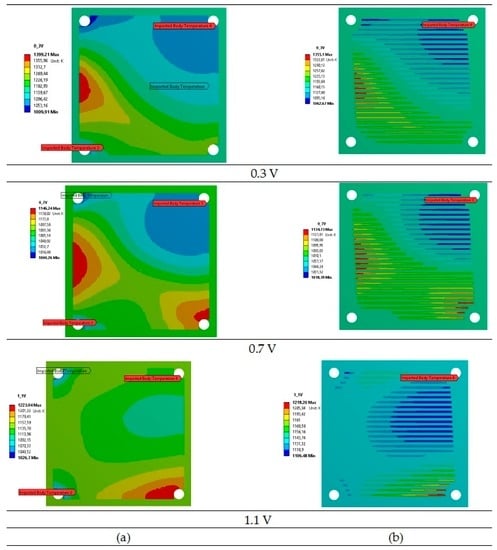 Figure 3. It can be seen that temperature increases rapidly between the air inlet located at the upper left corner and the air outlet located at the lower right corner due to the exothermic electrochemical reactions. The average temperature differences were equal to 389 °C, 146 °C, and 196 °C for the current tap voltages of 0.3, 0.7, and 1.1 V, respectively. The highest difference was noticed for the lowest operating voltage of 0.3 V. In addition, the highest temperature of the air was in the region between the air inlet and fuel inlet for the voltages of 0.3 V and 0.7 V, while, for the voltage of 1.1 V, it was in the region close to the air outlet. The temperature distributions were characterized by high non-uniformity, which may cause local thermal stresses and may lead to fuel cell damage. Thus, the next step was to analyze the planar SOFC behavior in terms of stress.