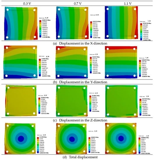 The lowest total displacement was equal to 0.06 mm, and it was for the voltage of 0.7 V. For the voltage of 1.1 V, it was equal to 0.09 mm. The computed highest total displacement was equal to 0.13 mm for the voltage of 0.3 V.