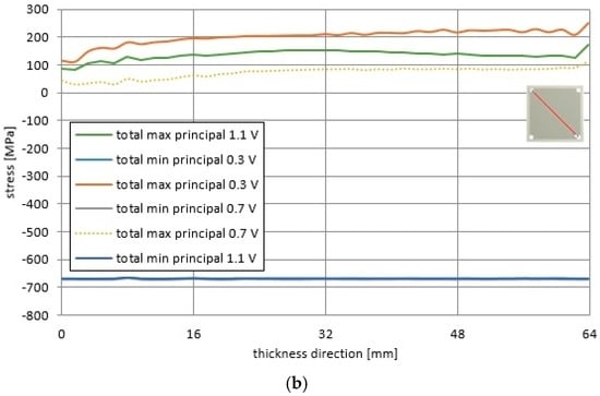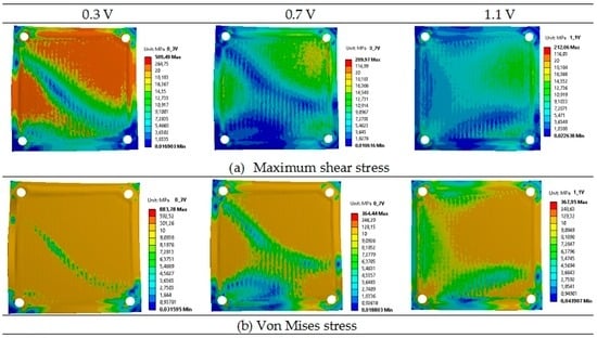 Figure 13, it can be noticed that the total minimum principal stresses for the considered voltage values was roughly equal to −670 MPa, while the total maximum principal stress was equal respectively to 240 MPa, 110 MPa, and 150 MPa for 0.3 V, 0.7 V, and 1.1 V.