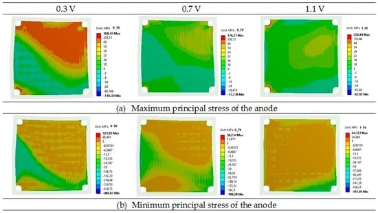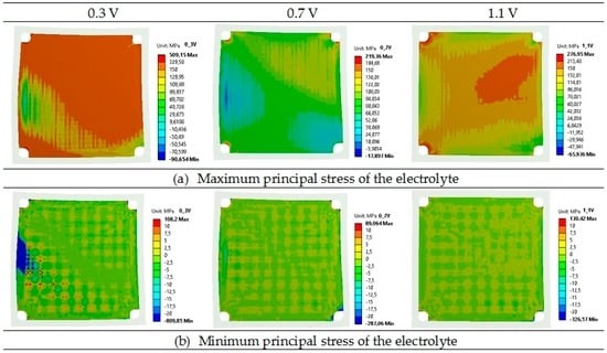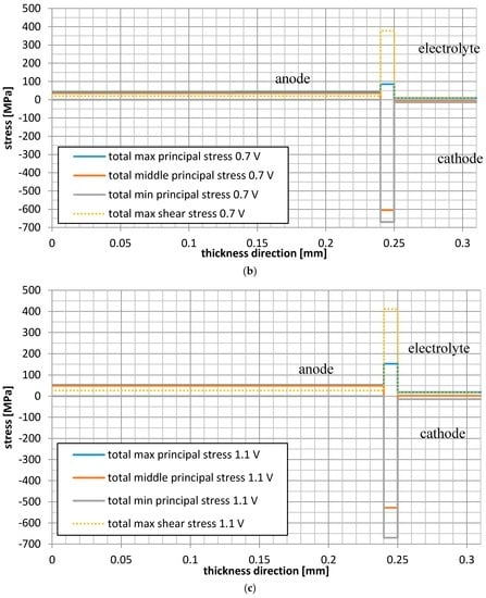 Figure 11, separately for the operational voltages of 0.3 V, 0.7 V and 1.1 V. The highest compressive total principal stress for the horizontal centerline was found for the electrolyte and it was equal to −670 MPa for all considered voltage values. The total principal stress for the cathode was in the range of −14.5 (compressive) to 15 MPa (tensile), while the highest tensile total principle stress was obtained for the anode and it was equal to 65.5 MPa, 52.0 MPa, and 41.5 MPa for the voltage values of 0.31 V, 0.71 V, and 1.1 V, respectively.