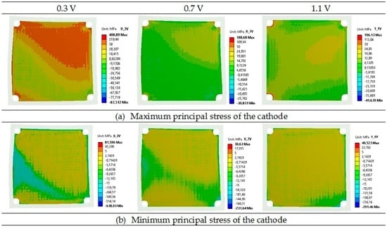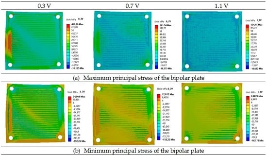 Lower principal stresses were noticed for the cathode, where the highest stresses were 409 MPa (tensile) and −639 MPa (compressive) for the operational voltage of 0.3 V. Slightly lower principal stresses were found for the anode, where again the highest values were obtained for the voltage of 0.3 V. The calculated values of principal stresses for the anode at 0.7 V and 1.1 V were quite similar. It should be underlined that the lowest principal stresses can be observed in the bipolar plate: the compressive stress of −192 MPa and the tensile stress of 400 MPa, both for the voltage of 0.3 V, are the worst case. The maximum and minimum values of the principal stress are assembled in