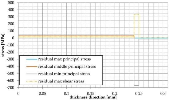 It should be underlined that, for all considered operational voltage values, the minimum total principal stresses were the same (roughly equal to −670 MPa) and depended only on the values of the residual stresses.