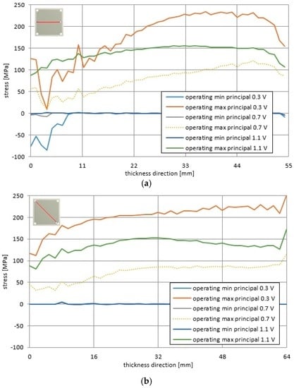 Table 5 shows that the greatest principal stresses were obtained for the voltage of 0.3 V, while the lowest were obtained for the voltage of 0.7 V. In addition, it should be underlined that both the total maximum and minimum principal stresses for all considered layers were tensile at the operational temperature.