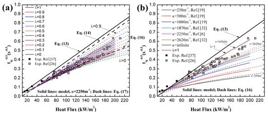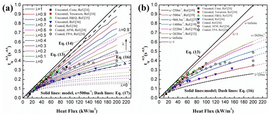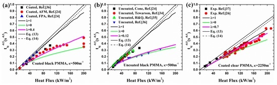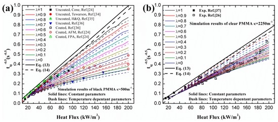 With different λ and κ, simulation results and analytical predictions of black PMMA are plotted in Figure 2. Coated surface experimental data is utilized based on the fact that some in-depth absorption occurs even in the presence of carbon black on the surface (e.g., [26]). In the analytical model, Equation (17) demonstrates the relationship between and under high heat flux. In Figure 2a, the simulation and analytical curves approach the classical ignition theory line, Equations (13) and (14), when λ increases from 0 to 1. This trend also verifies the qualitative correlation between and λ, namely Equation (18).
