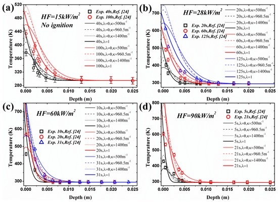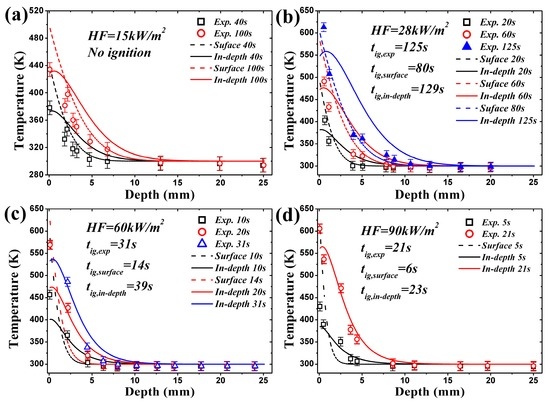 Simulated temperature curves are illustrated in Figure 5 along with the experimental results under the same four heat fluxes. The calculated temperature, employing critical mass flux criterion, with in-depth absorption is close to the measured values in tests. However, the temperature with surface absorption is much lower compared with experimental data, which again verifies the conclusion that the in-depth absorption must be considered in investigating the ignition mechanism of translucent materials. In Figure 5b–d, only temperature distribution at ignition time with surface absorption is plotted based on the fact that the simulated tig is lower than the measured one, such as 80 s < 125 s under 28 kW/m2 in Figure 5b. For all circumstances, before or at ignition time, the numerical model overestimates and underestimates the surface temperature, depth = 0, for surface and in-depth absorption, respectively. Non-monotone and monotone decreasing curves exists for in-depth and surface absorption, respectively. Beneath the heat penetration layer, the numerical model also overestimates the temperature. All these conclusions are exactly the same as the ones obtained from analytical model.