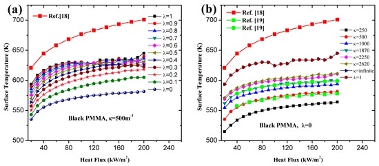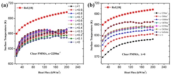 where are constant values determined by the thermal parameters of black PMMA. Black PMMA is manufactured by adding a small quantity of stain agent, which means the thermal characteristics keeps almost unchanged but the optical property is affected greatly. Thus the same and are used in calculating the ignition time of clear PMMA. The relationships between surface temperature and heat flux of black and clear PMMA with different λ and κ are shown in Figure 6 and Figure 7. The surface temperature of PMMA at ignition time increases with incident heat flux when using critical mass flux as the ignition criterion, which agrees with the conclusions of other researchers. The increasing rate is higher for low heat flux and decreases gradually as the heat flux goes larger. Higher surface temperature caused by larger λ and κ suggests that the opacity of materials contributes to the higher temperature. Obviously, gets exactly the same simulation results of . The overestimated surface temperature by Equation (22) is attributed to the negligence of heat of vaporization and convective and radiation heat loss from surface [18]. The numerical solution is in good accord with the results of ref. [19] for κ = 500 and 1400 m−1.