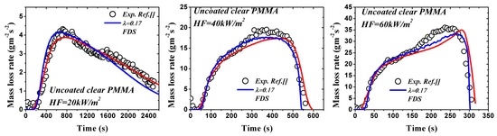 Measured mass loss rate in tests can also be employed to optimize λ. Since the optimization process has been conducted in ref. [27] for coated black PMMA, only the comparison between the numerical model and experimental data of uncoated clear PMMA available in ref. [29] is exhibited in Figure 9. The optimized λ = 0.17 is obtained according to the residual analysis for κ = 2250 m−1. The agreement between experimental, numerical and FDS [9] is fairly good. Combining with the corresponding optimized λ = 0.70 for coated clear PMMA discussed above, it can be concluded that the coated layer increases the surface absorptivity by 0.53 for clear PMMA. Obviously, this value is much larger than that of black PMMA, which may be mainly caused by the difference between in-depth absorption coefficients of materials, spectral characteristics of heater, optical properties and thickness of the painted black layer used by each researcher.