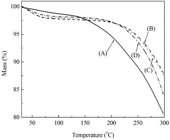 TG curves of soda lignin (A) and modified soda lignin with PEG-400 at various weight ratios (B) 1:2; (C) 1:3; (D) 1:4.