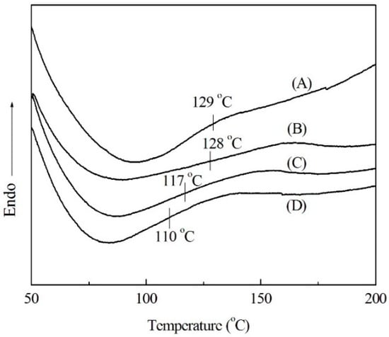 Moreover, the high weight loss process was mainly induced by the thermal degradation starting from the decomposition temperature (Td), which was defined as a temperature that gives a 5% weight loss []. The Td of modified soda lignin were 267 °C, 262 °C and 253 °C, respectively, which are higher than that of soda lignin at 209 °C. This result was similar to the changes in the glass transition temperature (Tg) of modified soda lignin, which were determined by DSC. As shown in Figure 2, the Tg of soda lignin gradually declined with increasing the weight ratios of PEG. Besides, the PEG contents in each modified soda lignin prepared with the ratios of 1:2, 1:3 and 1:4 were 19.4%, 24.5% and 31.1%, respectively. Accordingly, the high weight ratio of PEG gave rise to the low Td and Tg, which was probably attributed to a greater PEG moiety existing in modified soda lignin prepared with more PEG-400. This was also confirmed by FTIR measurements.