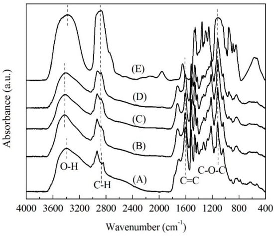 FTIR spectra of soda lignin (A) and modified soda lignin with PEG-400 at various weight ratios (B) of 1:2; (C) 1:3; (D) 1:4 and PEG-400 (E).