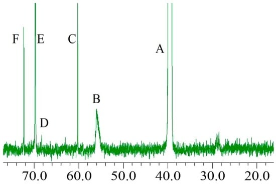 The PEG moiety was proved to be grafted in the lignin structure, and then the 13C-NMR was performed to elucidate the bonded position of the PEG molecule with respect to the lignin. Figure 4 illustrates the 13C-NMR spectrum of modified soda lignin with a weight ratio of 1:3. The signals at 39.9 ppm (Figure 4A) and 56.1 ppm (Figure 4B) were assigned to the carbon atom in DMSO-d6 of the solvent and to the methoxy groups of soda lignin, respectively, which could be detected at the same chemical shifts in the soda lignin. After modification with PEG, new strong signals at 60.2 ppm and 72.3 ppm (Figure 4C,F) and 69.8 ppm (Figure 4E), which were assigned to the methylene carbon of the alcoholic end groups of PEG and the methylene carbon of the repeating unit of the PEG chain, respectively, were clearly detected []. Additionally, a small signal at 68.8 ppm (Figure 4D) was assigned to the methylene carbons bonded to the alpha carbon on the soda lignin side chain through an ether linkage [,]. These results strongly suggested that the PEG chain was grafted at the alpha carbon of the soda lignin with an ether bond, which was in good accordance with the FTIR analysis.